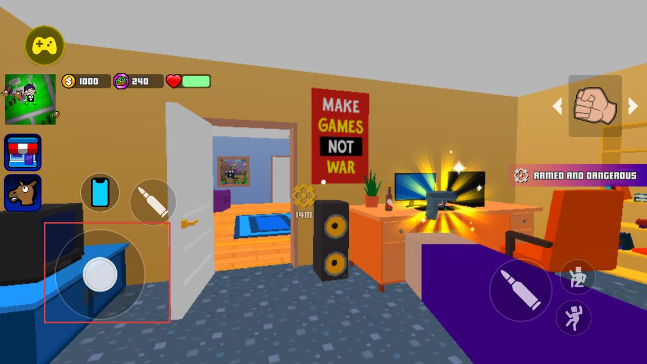 2、在室内场景中通过左侧虚拟摇杆移动角色,界面显示金钱、道具等信息,可与场景内物品互动,探索房间寻找资源或任务线索。