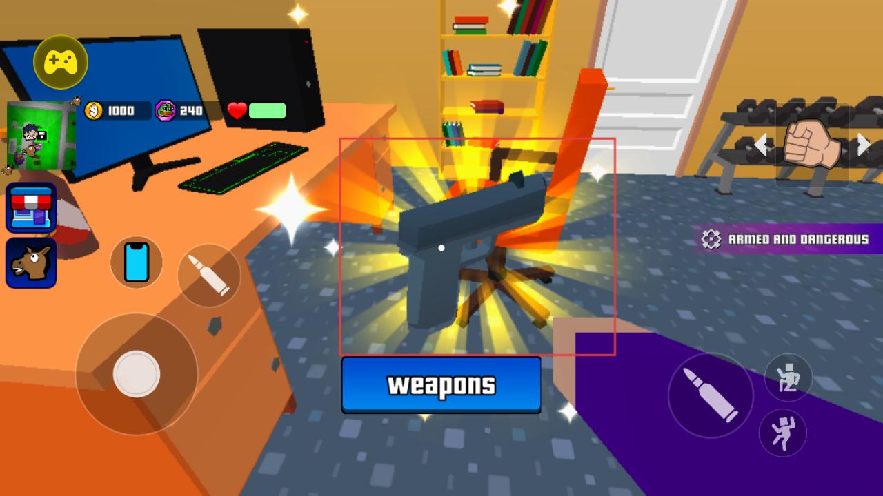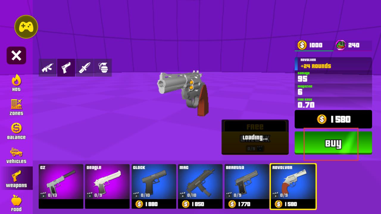 4、进入武器商店界面,可查看左轮、手枪等多种枪械的属性,花费金钱点击buy购买心仪武器,增强自身战力,在沙盒世界中畅快冒险。