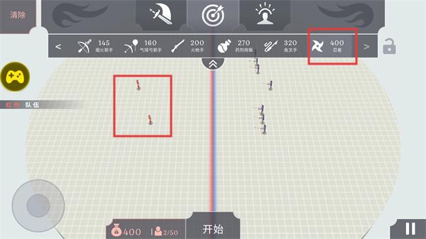 1、在兵种选择栏挑选飞鸽等兵种,消耗资源在左侧部署红色队伍,规划好阵型,为对战蓝色队伍做好准备,开启战术博弈。