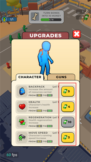 4、在升级界面用金币升级背包、生命值、移速等角色属性和枪械,走个性化英雄培养路线,强化战力,更好应对动态难度的僵尸挑战,助力末世生存。