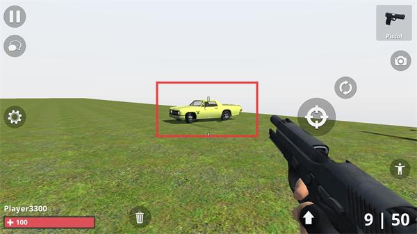 2、生成车辆后,使用手枪等武器与车辆互动,在沙盒世界中开展射击等操作,体验武器与载具的互动玩法。