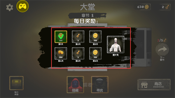 2、在大堂界面可领取每日奖励,包括金币、钥匙、角色等,通过每日登录积累资源,为后续游戏体验提供助力。