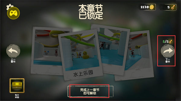 4、完成当前章节任务后,可解锁下一章节如水上乐园,开启新的后室逃脱场景,体验不同地图的恐怖冒险,解锁更多游戏内容。