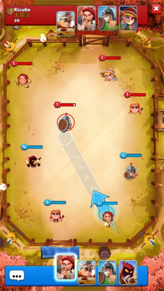 2、匹配成功后,向下滑动屏幕调出攻击路线,调整角度瞄准敌方单位发起攻击。