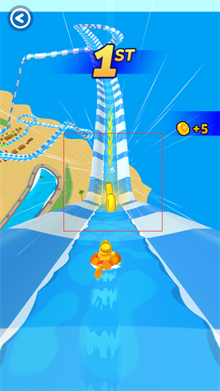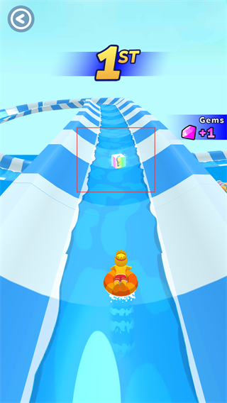 1、处于水滑梯赛道,当前排名为1st,赛道中出现道具,获取该道具后Cems数量增加,借助游泳圈在赛道上滑行推进竞技比赛。