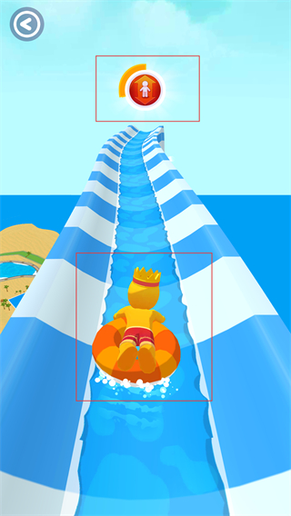 2、角色佩戴皇冠处于水滑梯赛道,上方出现特效标识,借助游泳圈在赛道内滑行,周围是海滩景观,保持着当前的领先排名。