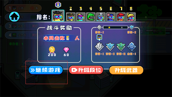 4、淘汰对手后进入结算界面,点击继续游戏按钮,开启新一轮的像素太空杀对战挑战。