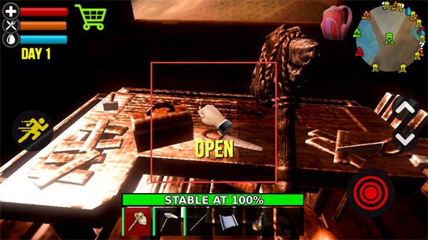 2、靠近桌上的箱子,点击OPEN选项将其打开,获取箱内的物品,补充制作需要的资源。