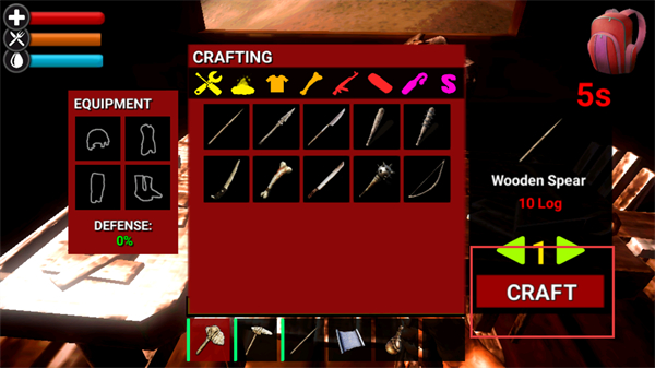 3、进入CRAFTING界面,选择要制作的Wooden Spear,确认所需材料后点击CRAFT按钮,开始制作。