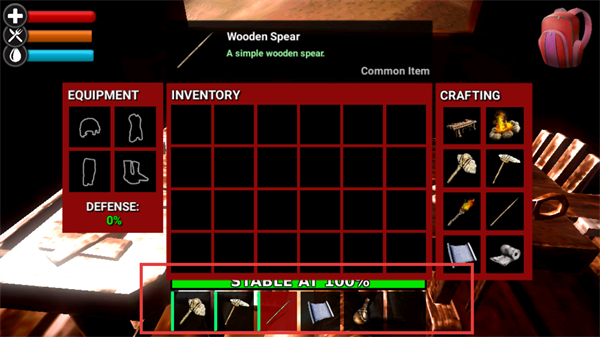 4、制作完成后,在INVENTORY界面查看已获得的Wooden Spear,将其装备到角色身上,提升生存能力。
