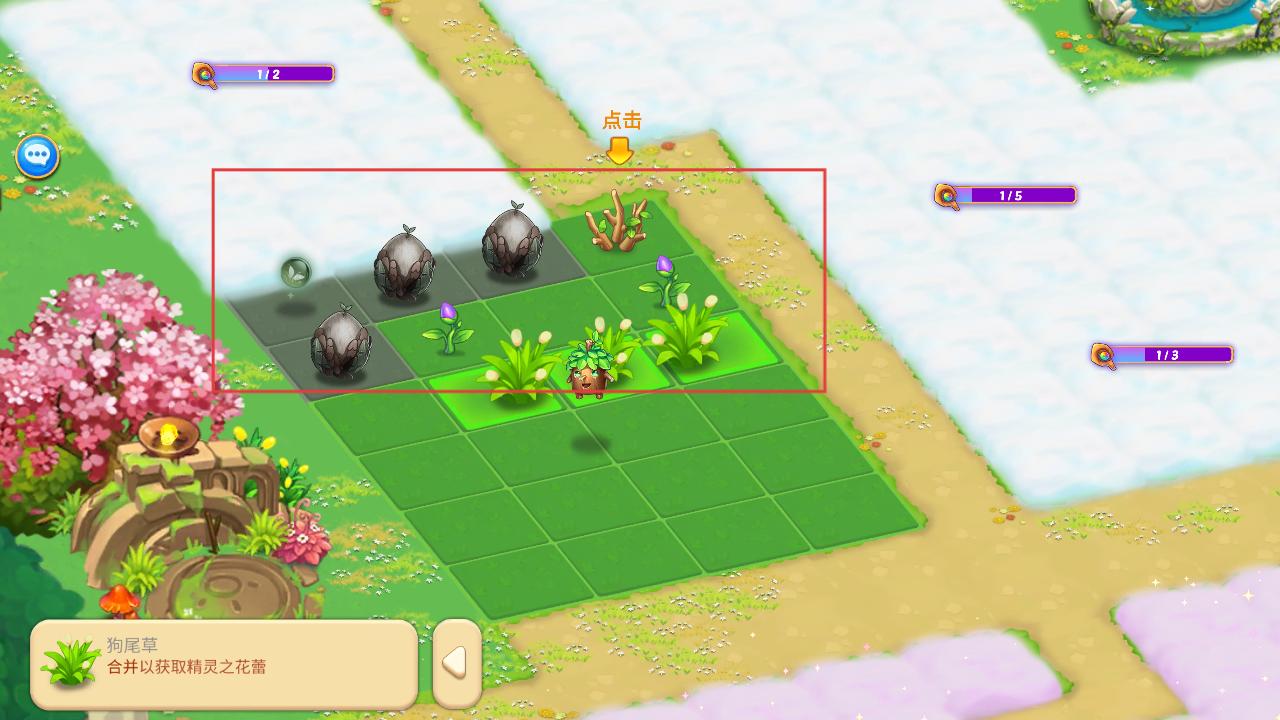 4、在花园里有狗尾草等植物,可将它们进行合并,合并后能获取精灵之花蕾,不断合成来丰富花园里的植物与精灵。