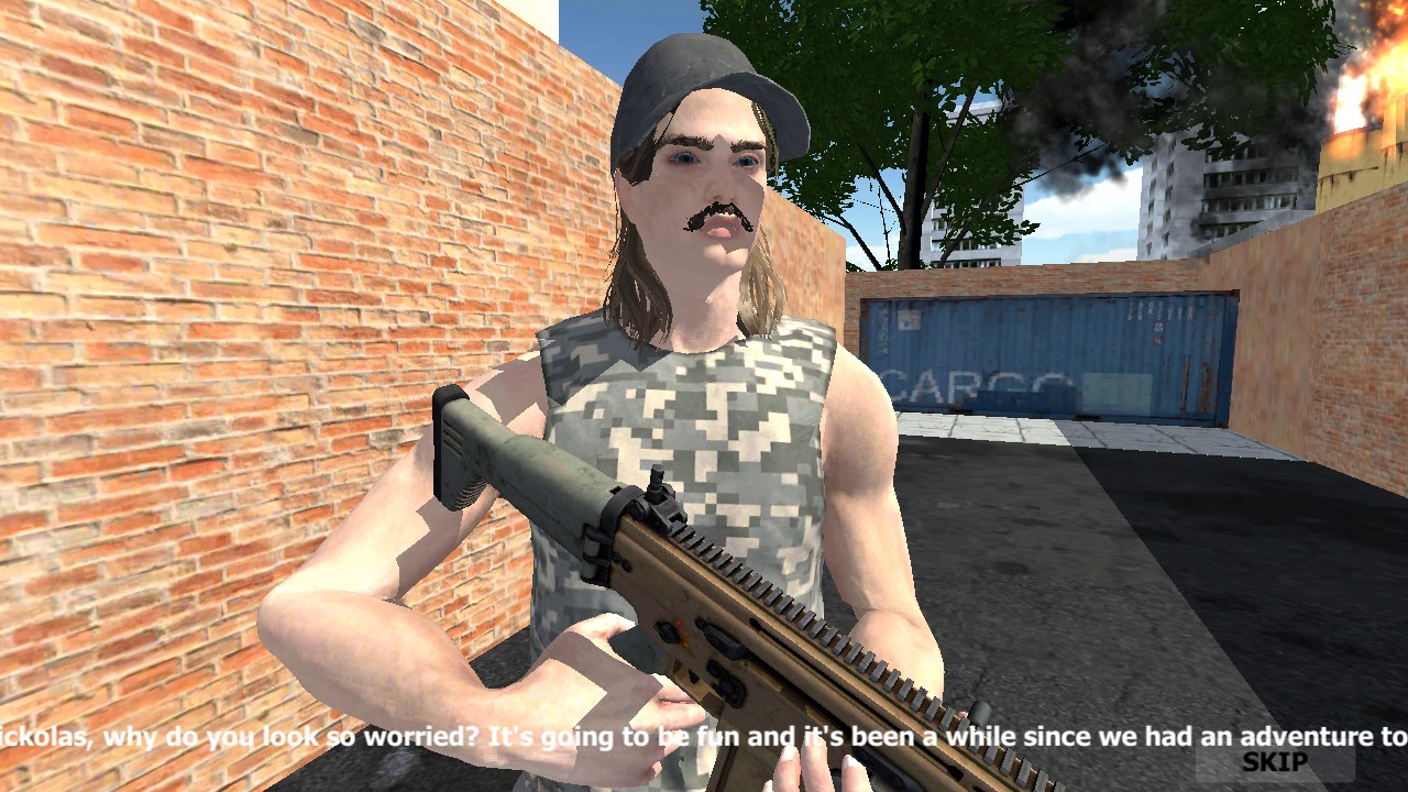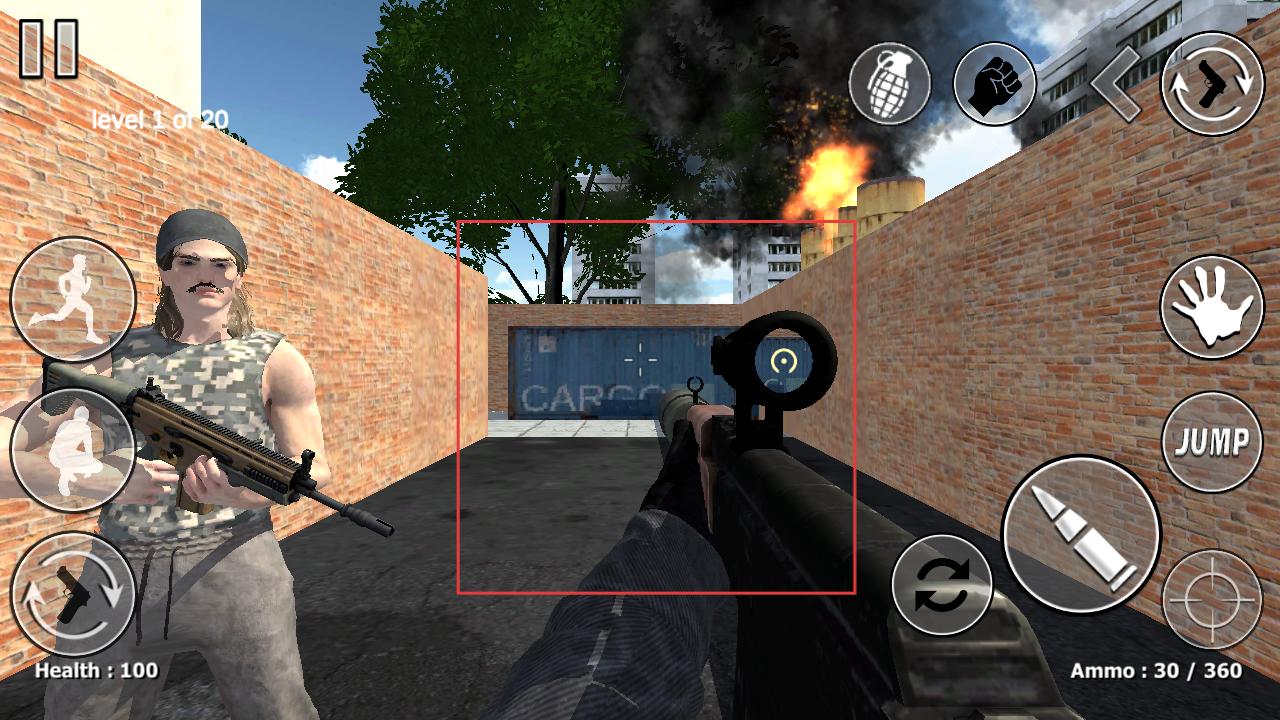 2、进入关卡后,使用屏幕上的操作按钮,控制角色移动、瞄准,利用枪械对准目标,准备射击。