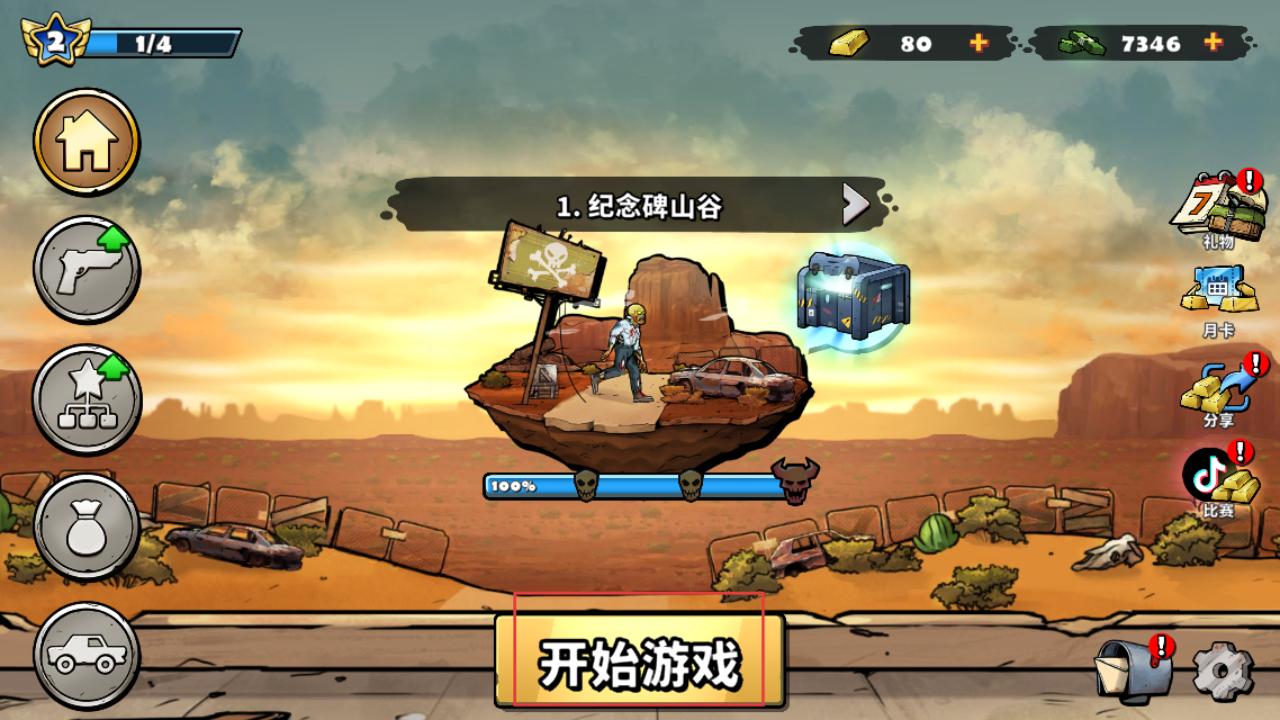 1、进入游戏可选择如纪念碑山谷等场景,点击开始游戏即可开启末日求生的冒险之旅,在不同场景中应对僵尸威胁。