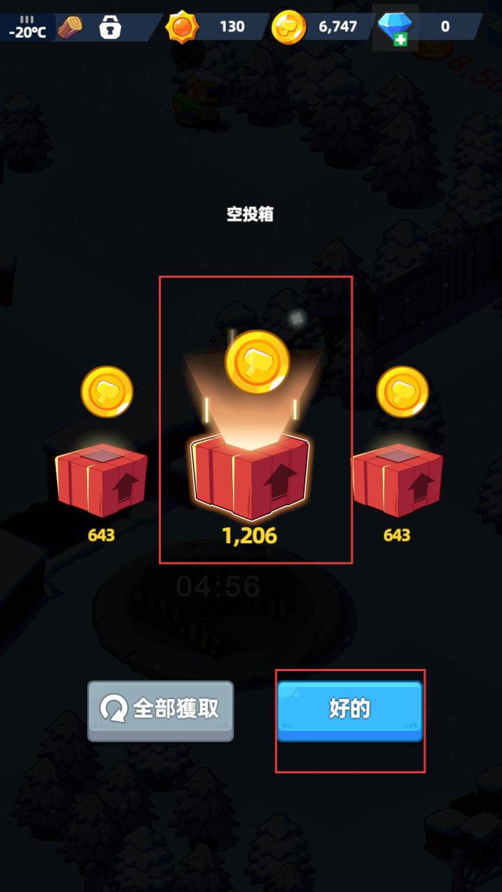 3、打开补给箱后,会显示获得的金币数量,点击好的按钮领取金币,这些金币可用于升级设施、培训幸存者等。