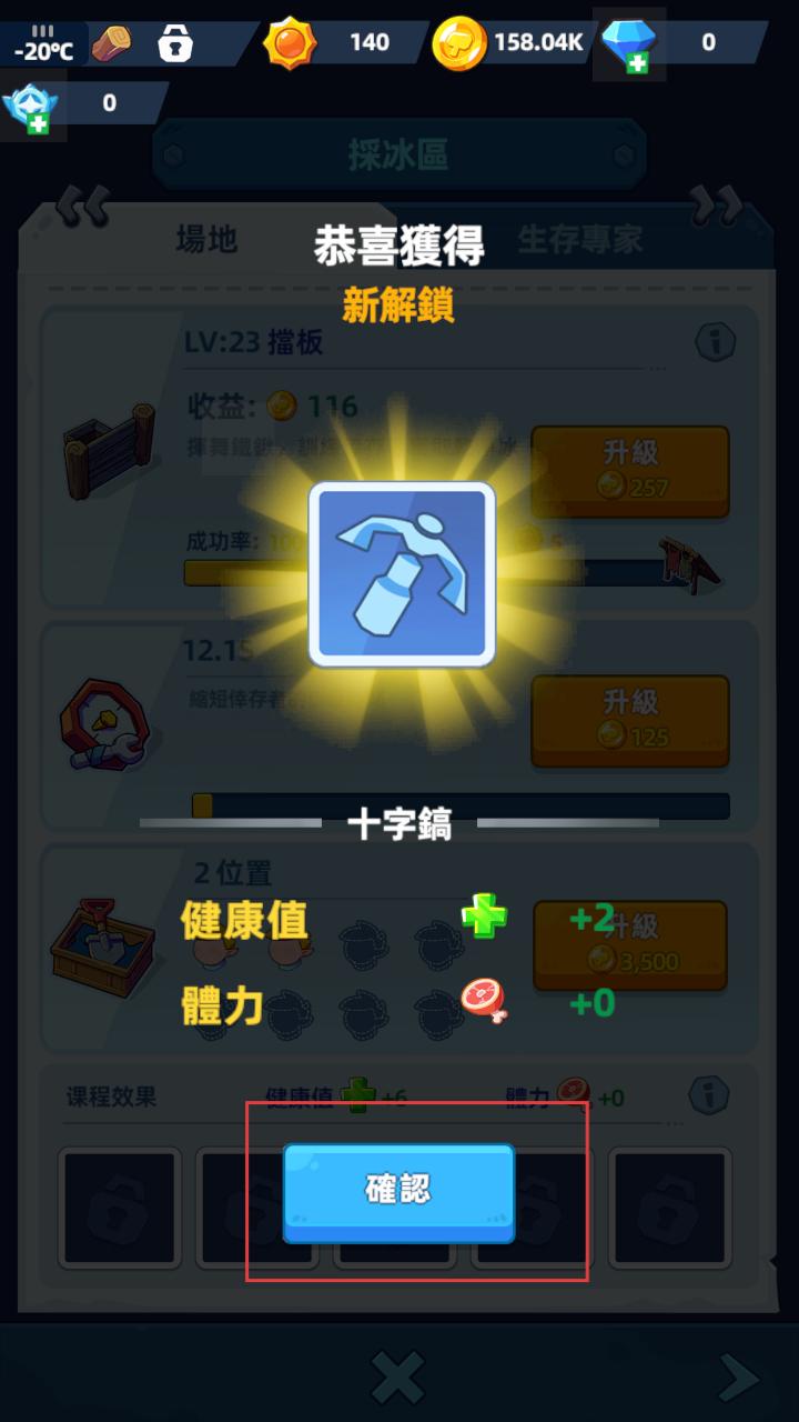 4、领取奖励后可能解锁新道具,如十字镐,点击确认按钮完成解锁,新道具可提升幸存者采集或建设效率,推动避难所发展。