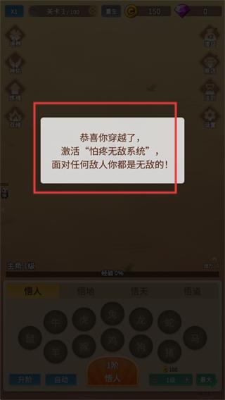 1、进入游戏先触发穿越提示,激活怕疼无敌系统,面对任何敌人都无敌,开启融合Roguelike与挂机战斗的休闲游戏之旅。
