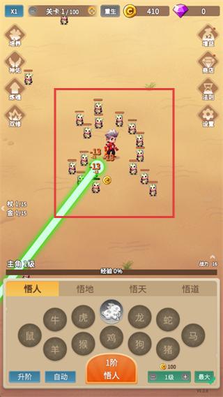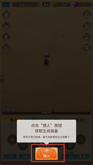 2、点击1阶悟人按钮获取生肖装备,新手引导结束,接下来可自行探索游戏,体验技能组合与离线收益等核心玩法。