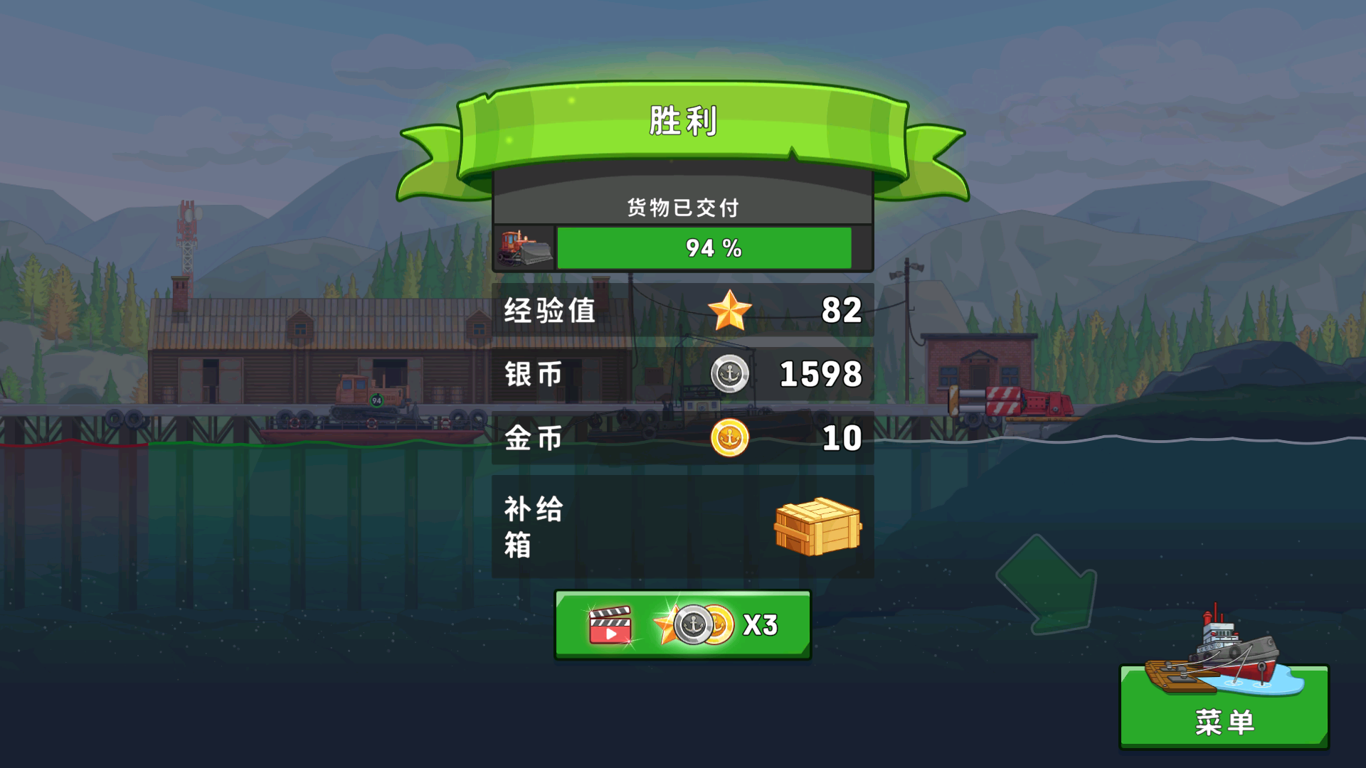 3、任务完成与成长:将船停靠至终点绿色区域,根据货物完整度获奖励,用收益升级船舶或解锁新船型。