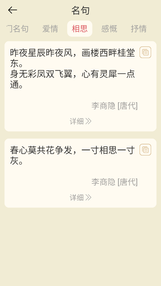 3、名句页面,可选择爱情、相思、感概、抒情等题材,寻找相关的名句。