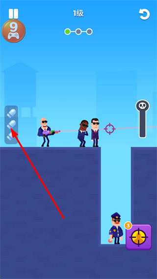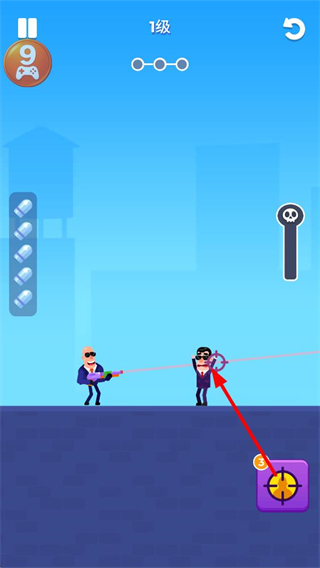 1、进入游戏1级关卡,操控特工瞄准敌人,点击右下角紫色瞄准按钮,发射武器攻击敌人,左侧显示弹药数量,需合理利用弹药通关。