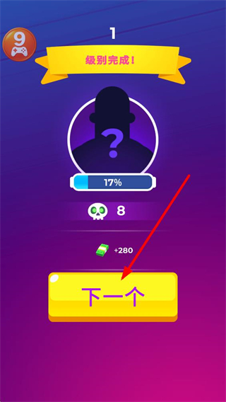 4、完成关卡后,会显示级别完成界面,可查看消灭敌人数量、获得的金币奖励,点击下一个按钮进入下一关继续挑战。