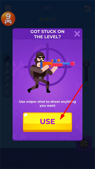 3、若关卡卡住,可使用狙击射击道具,点击USE按钮,利用狙击枪射击任意目标,助力通关。