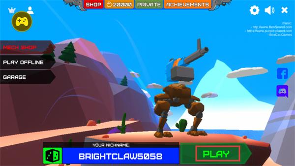 1、进入游戏主界面,可选择MECH SHOP、GARAGE等功能,点击PLAY按钮,即可开启科幻机甲主题的射击冒险之旅。