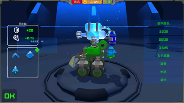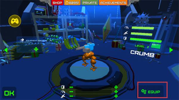1、在机甲装备界面,可查看机甲的各项属性,点击EQUIP按钮,为机甲配备合适的部件,提升其战斗能力,为后续战斗做准备。