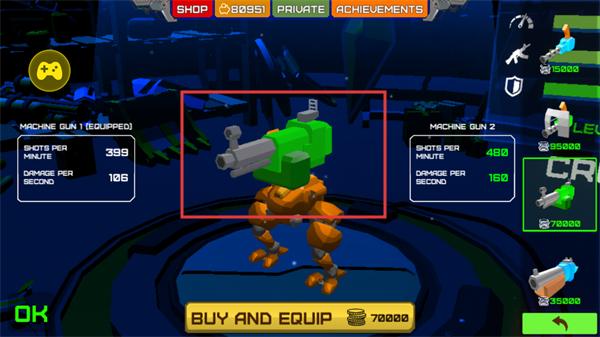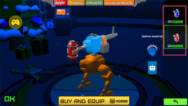 2、进入商店界面,可花费金币购买武器或道具,点击BUY AND EQUIP按钮,为机甲装备新的武器,增强其攻击手段。