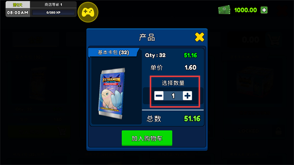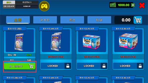 1、进入商品界面,可见基本卡包等商品,点击基本卡包的加入购物车按钮,开始为店铺进货,开启卡牌超市的经营备货流程。
