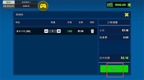 3、在购物车界面查看订单摘要,包含小计、快递费等信息,点击购买按钮,完成卡包进货,为店铺补充卡牌货源。