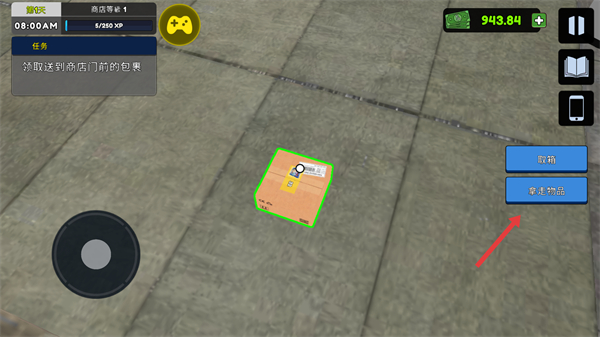 4、在店铺外看到包裹,点击拿走物品按钮,领取进货的卡包包裹,接收货物,继续开展卡牌超市的经营,为后续销售做准备。