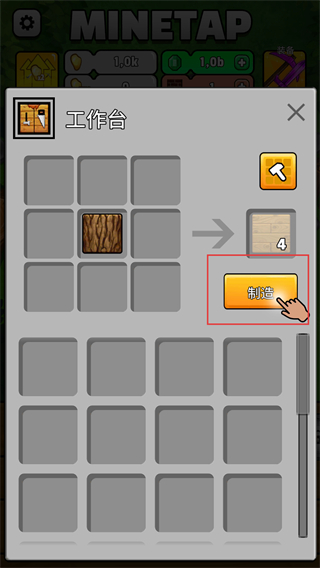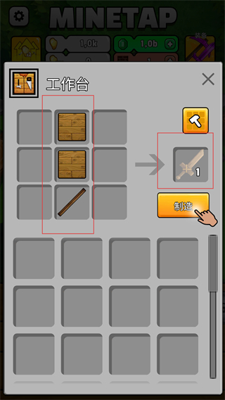2、放入木板与木棍,点击制造按钮,合成对应的工具,获得新的实用道具,丰富自身可使用的装备类型。