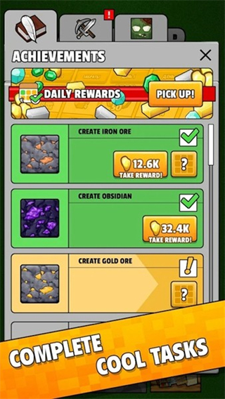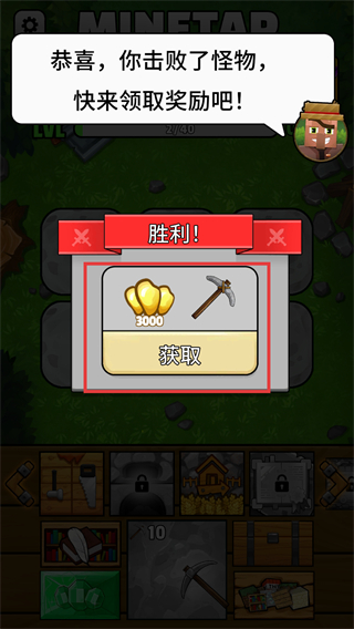 4、点击获取按钮,领取对应的金币与镐子奖励,获得击败怪物后的资源与道具,助力后续的游戏进程。