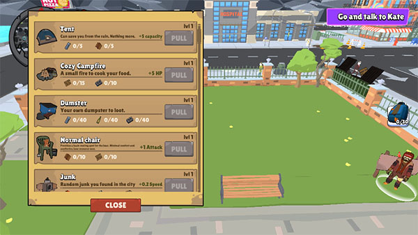 2、资源搜集机制,垃圾桶、废弃建筑藏有食物与材料,搜集需规避危险垃圾,部分道具需分类变卖换钱,资源获取直接关联生存时长。