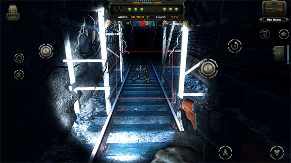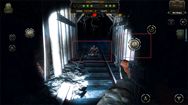 2、瞄准前方出现的变种生物,点击射击按键发起攻击,命中后敌人会呈现受伤状态。