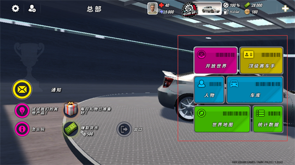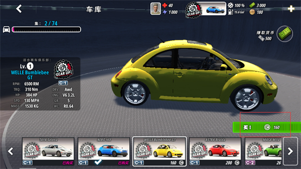 3、在总部界面点击车库按钮,进入车辆管理界面,可查看、选择或购买不同车型。