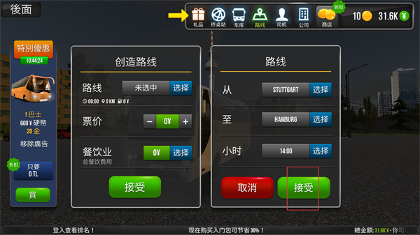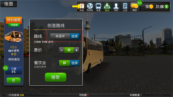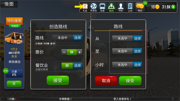 1、进入创造路线界面,先点击路线旁的选择按钮,开启路线相关的设置流程,同时可调整票价和餐饮业选项。