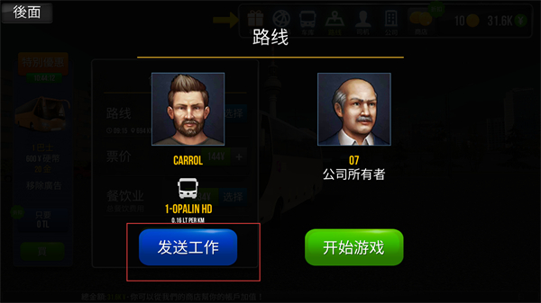 4、完成路线配置后进入路线界面,选择对应的司机和车辆,点击发送工作按钮,启动该路线的运营。
