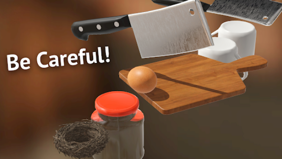 2、点击滑动左边按键控制蛋滚动跳跃,避开菜刀砧板等厨房障碍,利用斜坡加速、打蛋器弹跳等机制穿越路径,在限定时间内抵达巢穴。