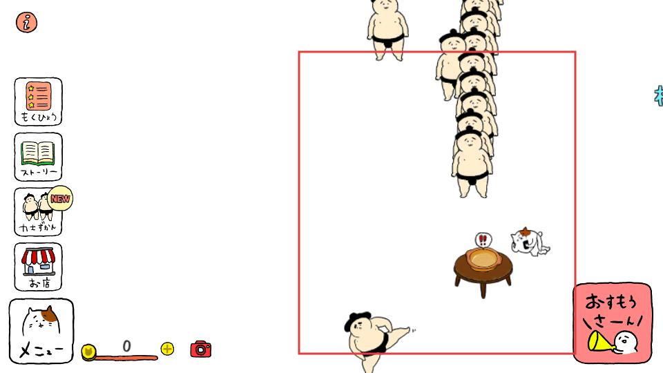 2、在餐厅场景,能看到相扑选手队列,还有猫咪等元素,点击右侧按钮,吸引相扑选手来用餐。
