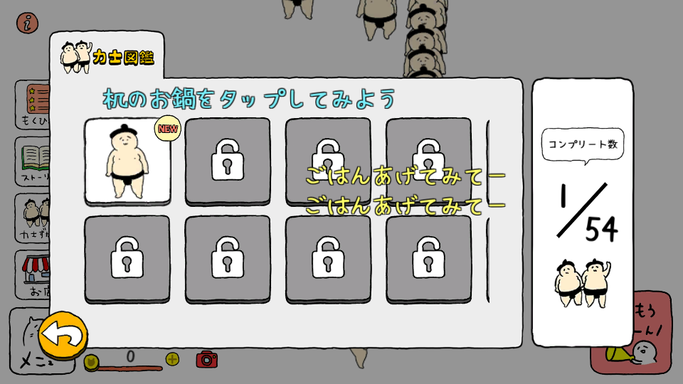 1、特色食材系统:针对相扑选手设计高热量专属菜单,包含什锦火锅与特制饭团等真实日式料理,每种餐点需调配不同食材比例满足顾客需求。
