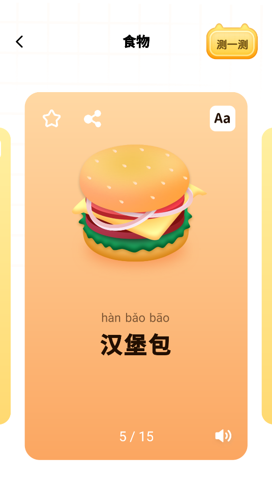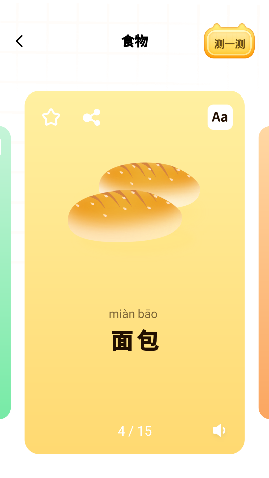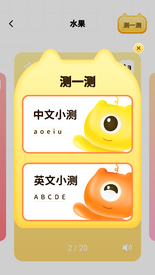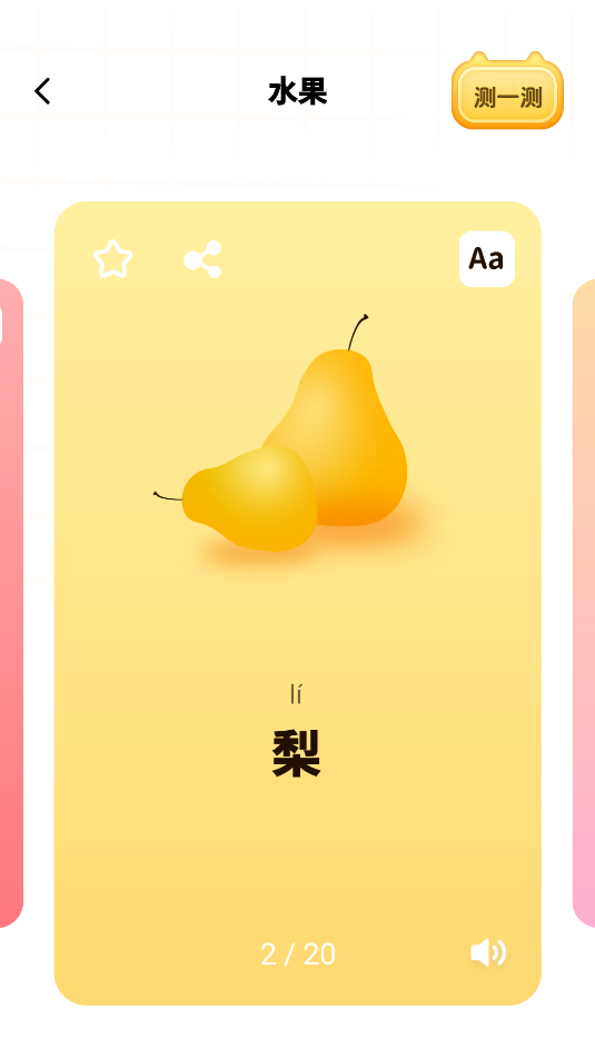 3、可以左右滑动来切换其他水果,点击右上角的测一测,可以测一测英文的发音。