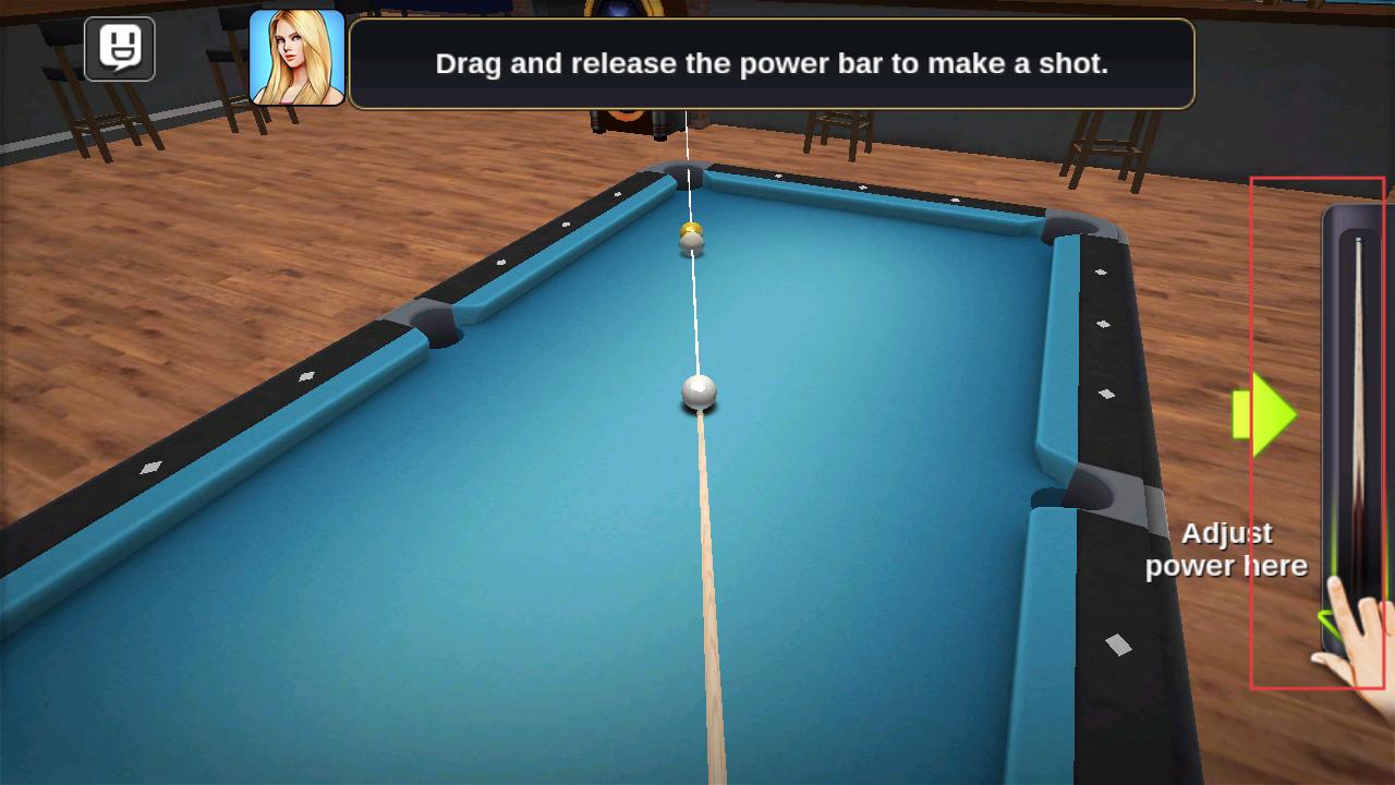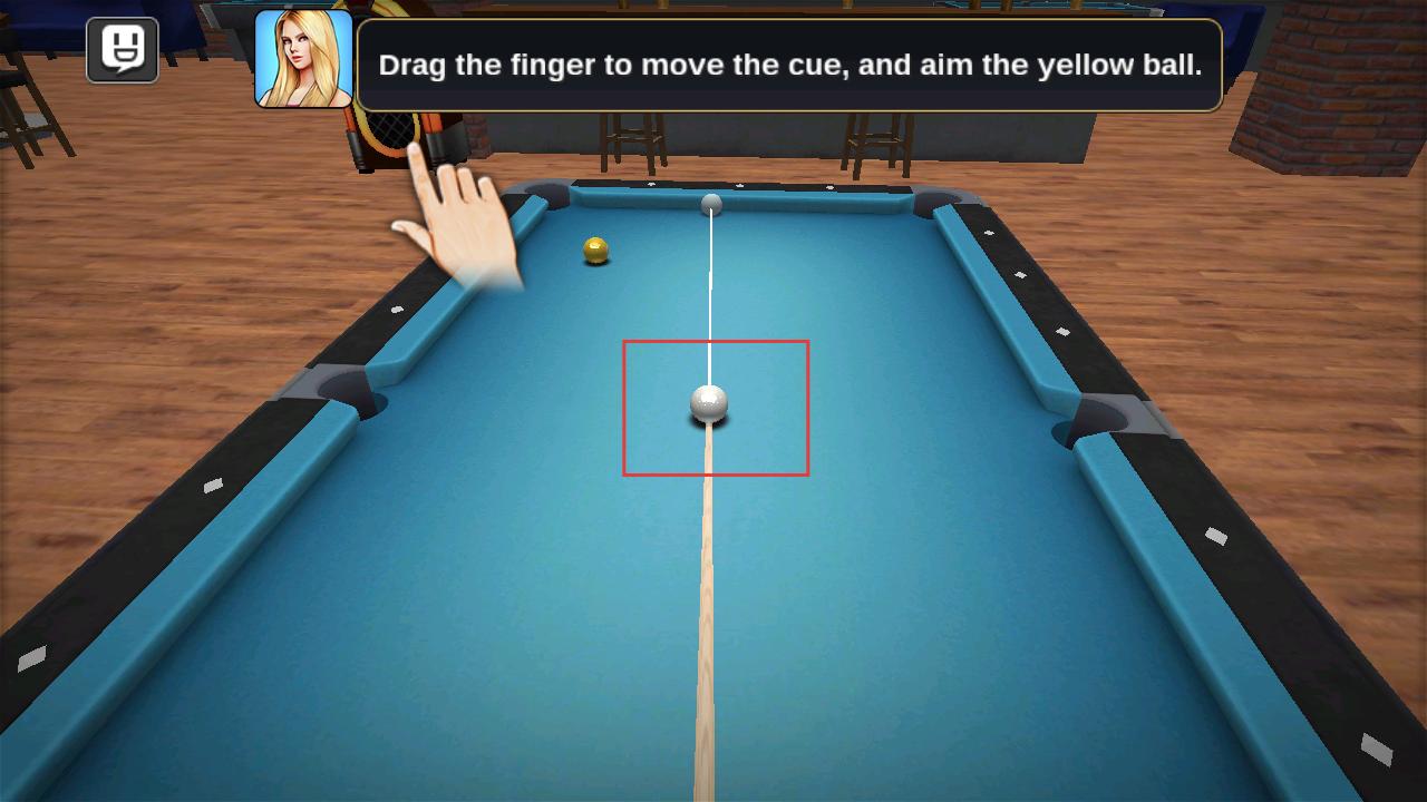 1、进入游戏,按照提示拖动手指移动球杆,调整位置瞄准黄色球,为击球做好准备。