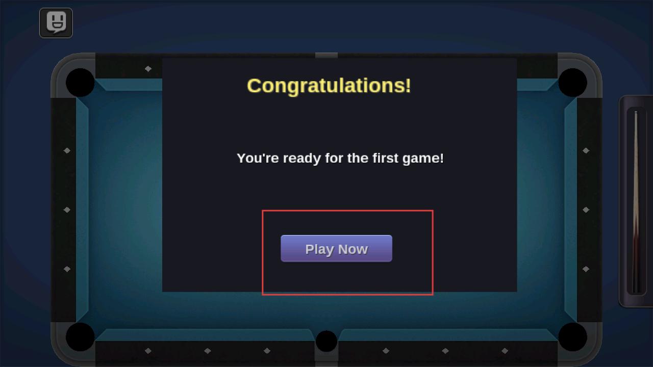 4、完成练习后,界面会显示祝贺提示,此时点击Play Now按钮,即可开启正式的台球比赛。