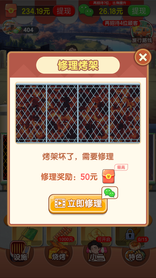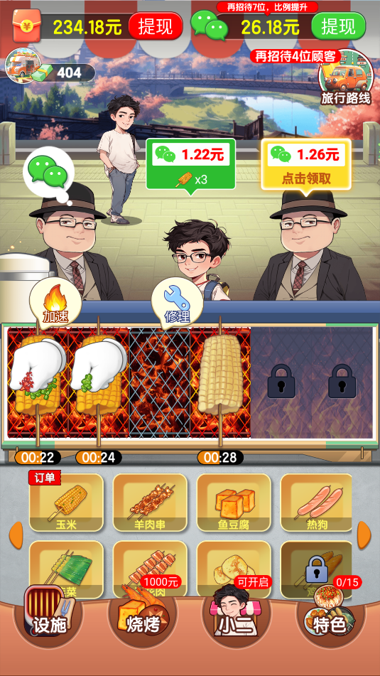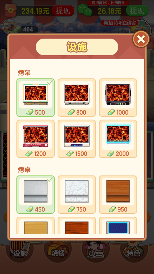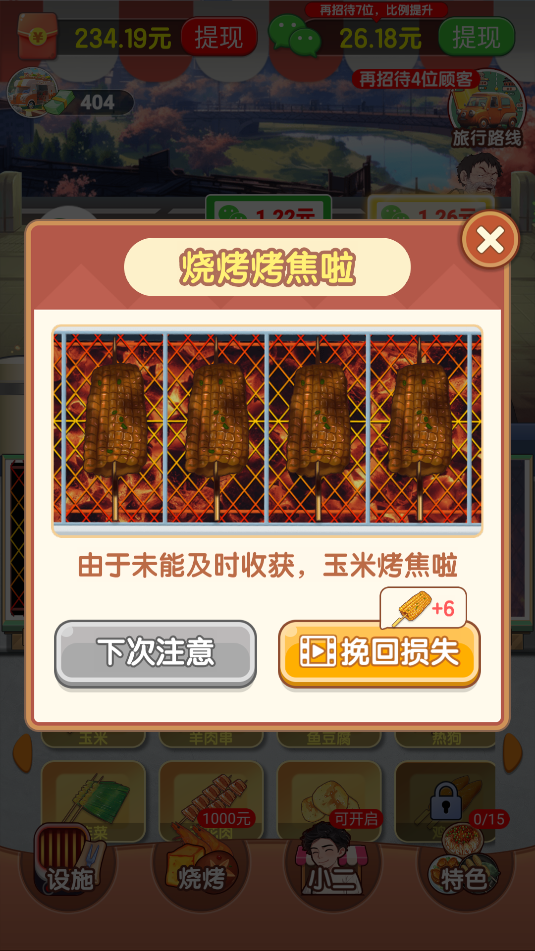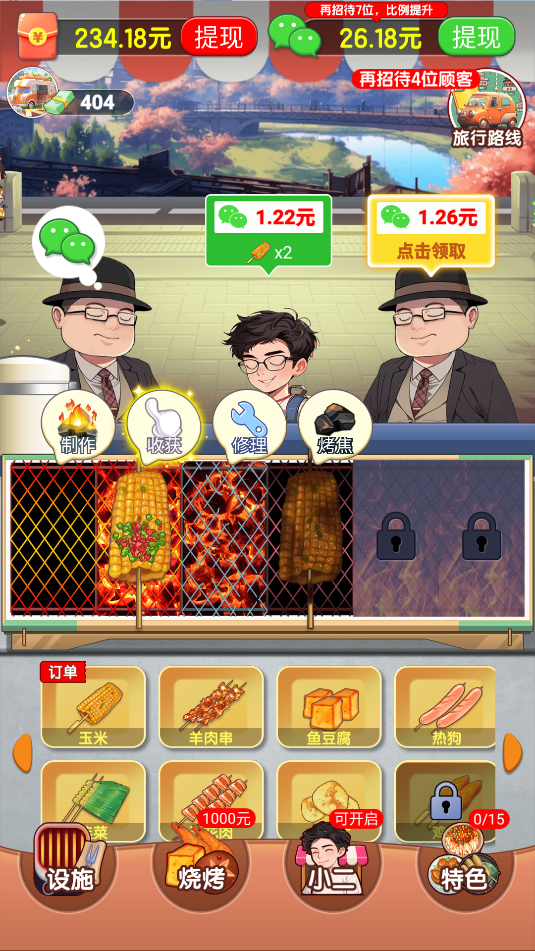1、根据客户下的订单,制作出订单的食品,烧烤完成后点击收获,为客户完成订单。