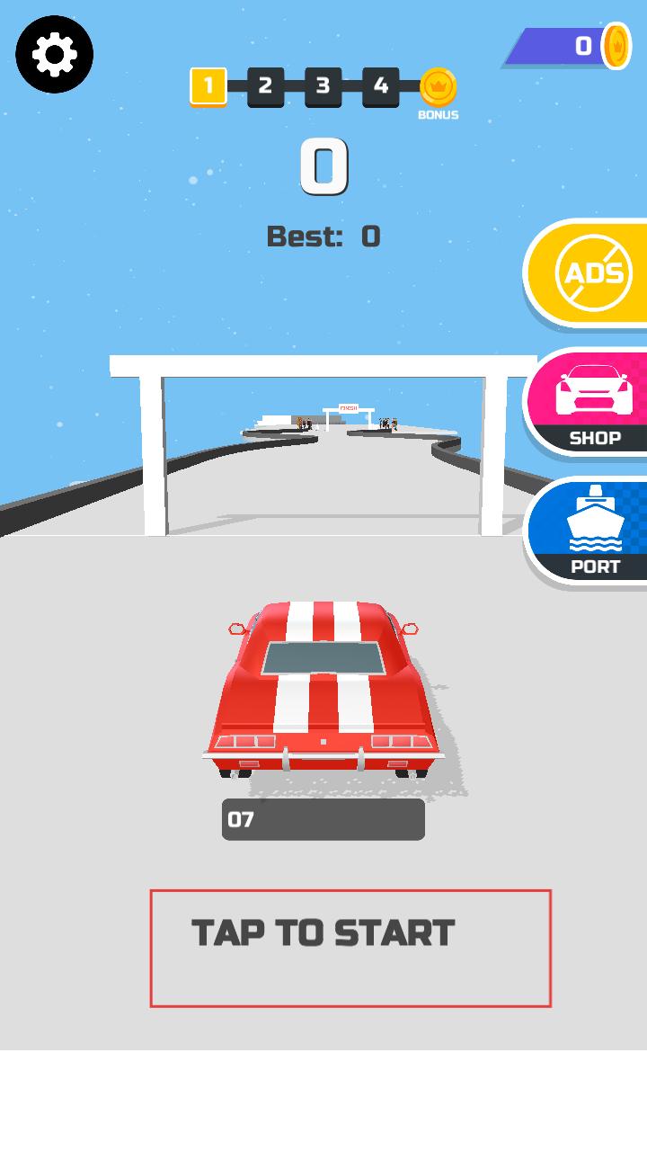 1、游戏开始,能看到一辆红色带白纹的赛车停在起点,屏幕下方有TAP TO START提示,点击后即可开启赛车之旅。