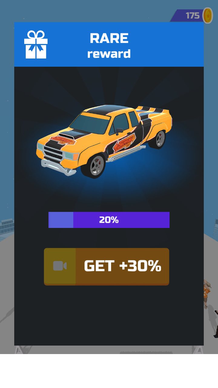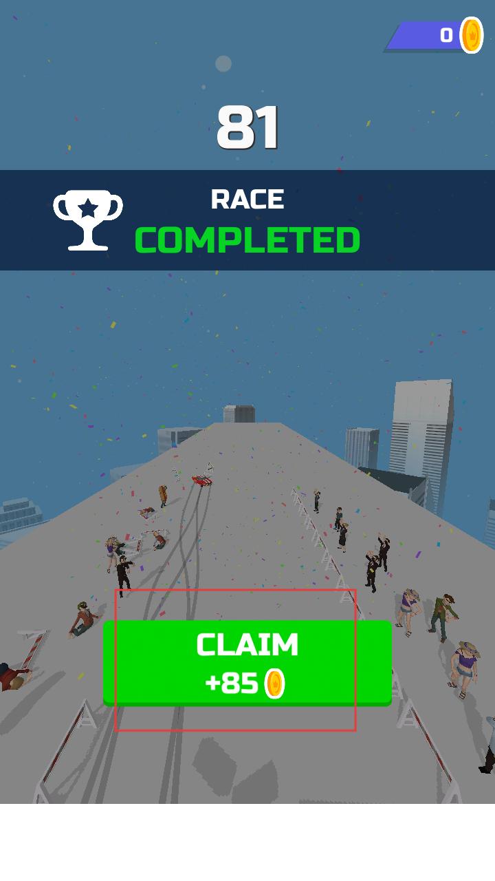 4、当赛车冲过终点线,会出现RACE COMPLETED的提示,屏幕下方有绿色的CLAIM按钮,点击可领取85个金币,完成本次比赛。