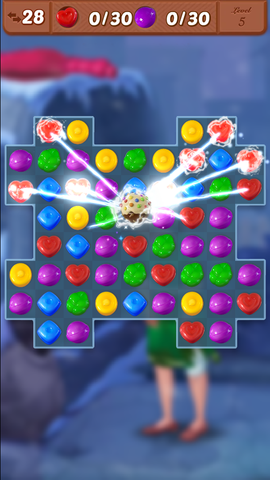 2、消除30个红心糖果和30个紫色糖果即可获得奖励。