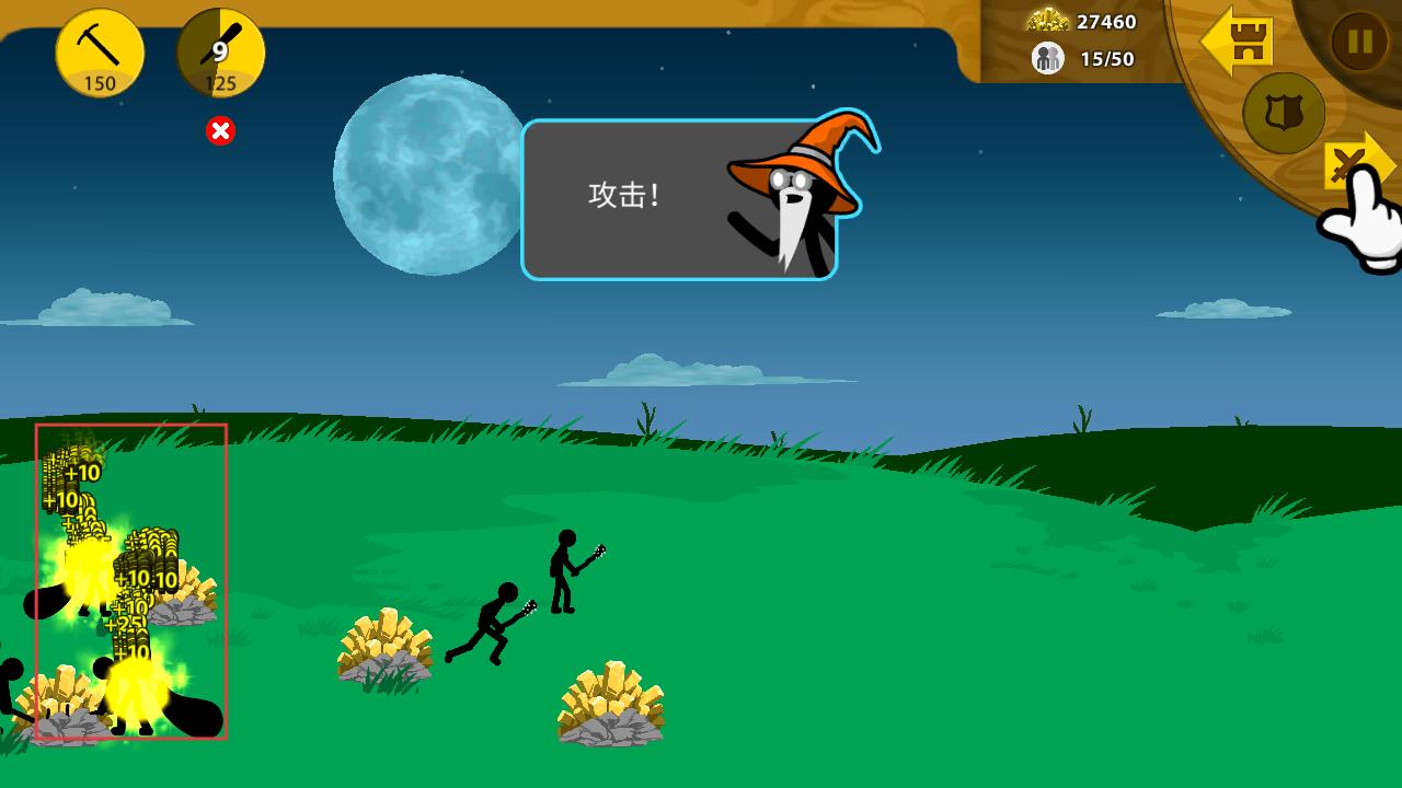 2、战斗中矿工持续采集黄金,积累资源,同时可根据提示指挥士兵攻击,合理利用资源和兵力推进战斗。
